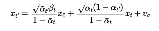 While the quality of the one-step denoising is not very good, we can improve it by iterating the denoising process. The iterative denoising process is implemented by passing the noisy images through the denoising model multiple times. We separately denoise the images at time steps 250, 500, 750. The formula for iterative denoising is given by: