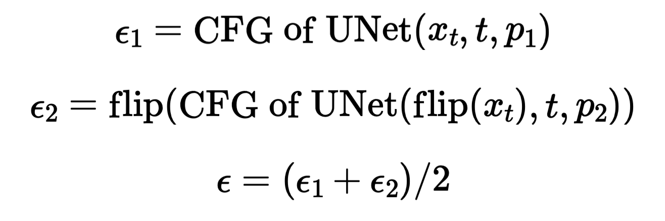 This section implements the visual anagrams. In every denoising step, we predict the normal noise and we also predict the noise flipped based on the flipped prompt. We then simply flip the flipped noise back and add them together to get our final perdicted noise. The process is given by the following formula: