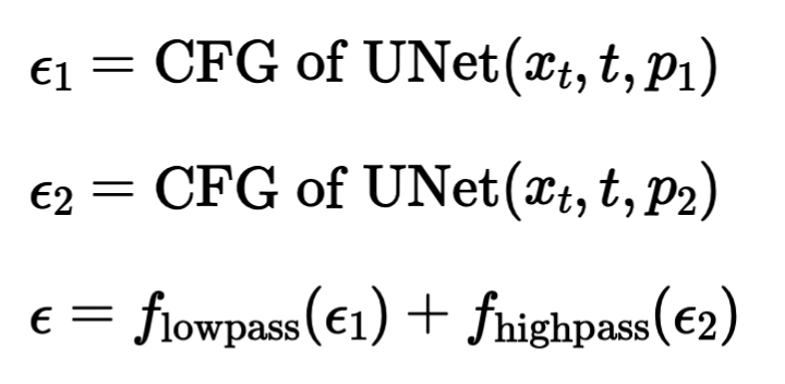 This section implements hybrid images. This is done by predicting noises both in the low frequency and the high frequency domains. We then add them together to get our final noise. The process is given by the following formula: