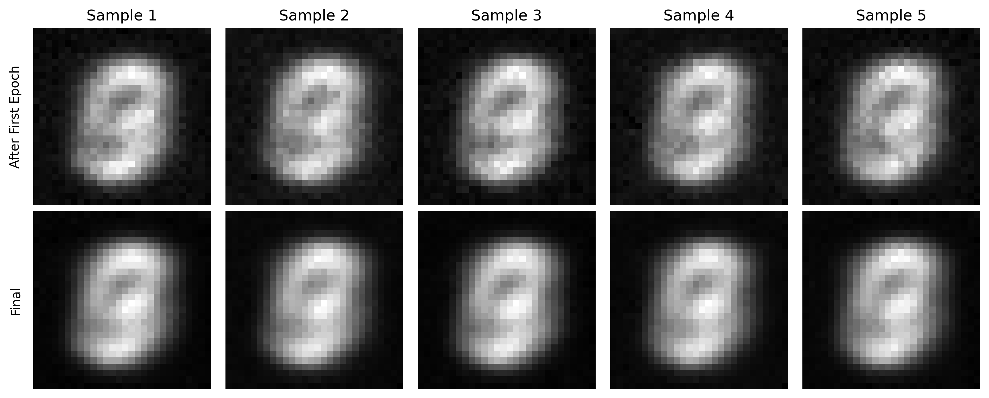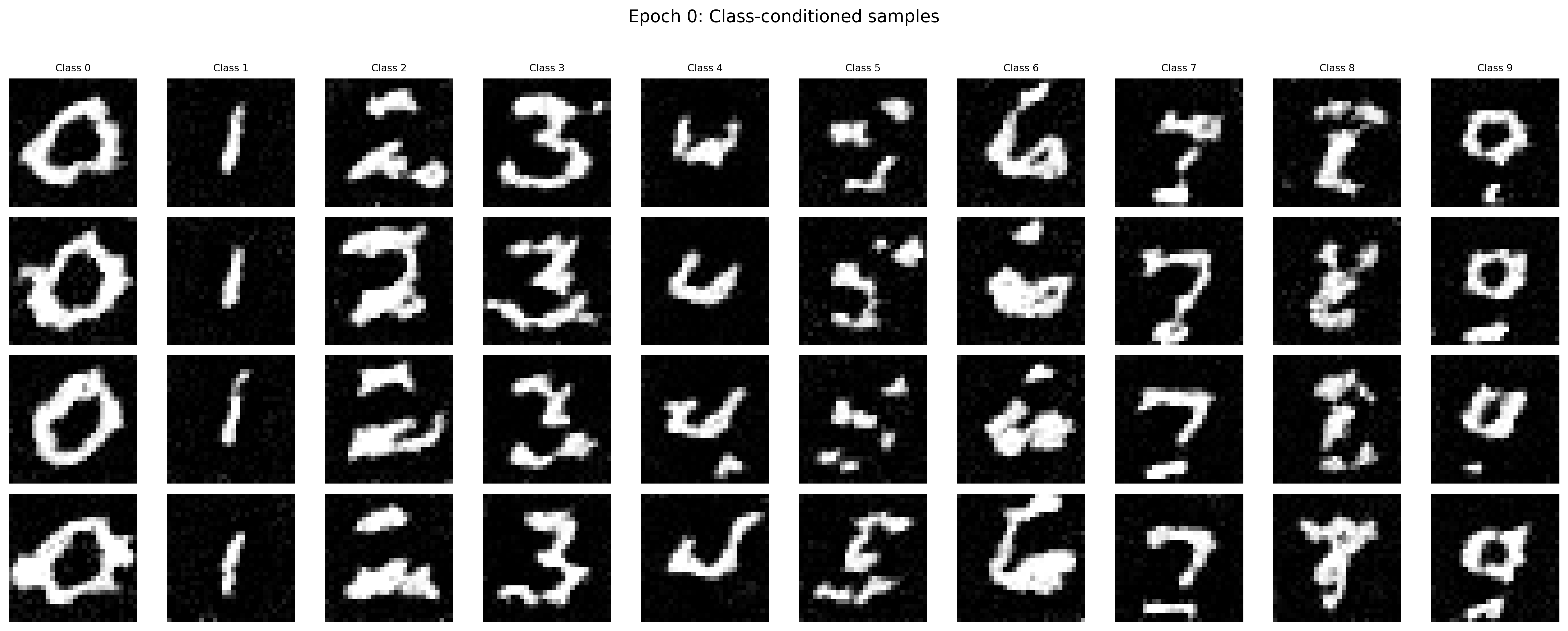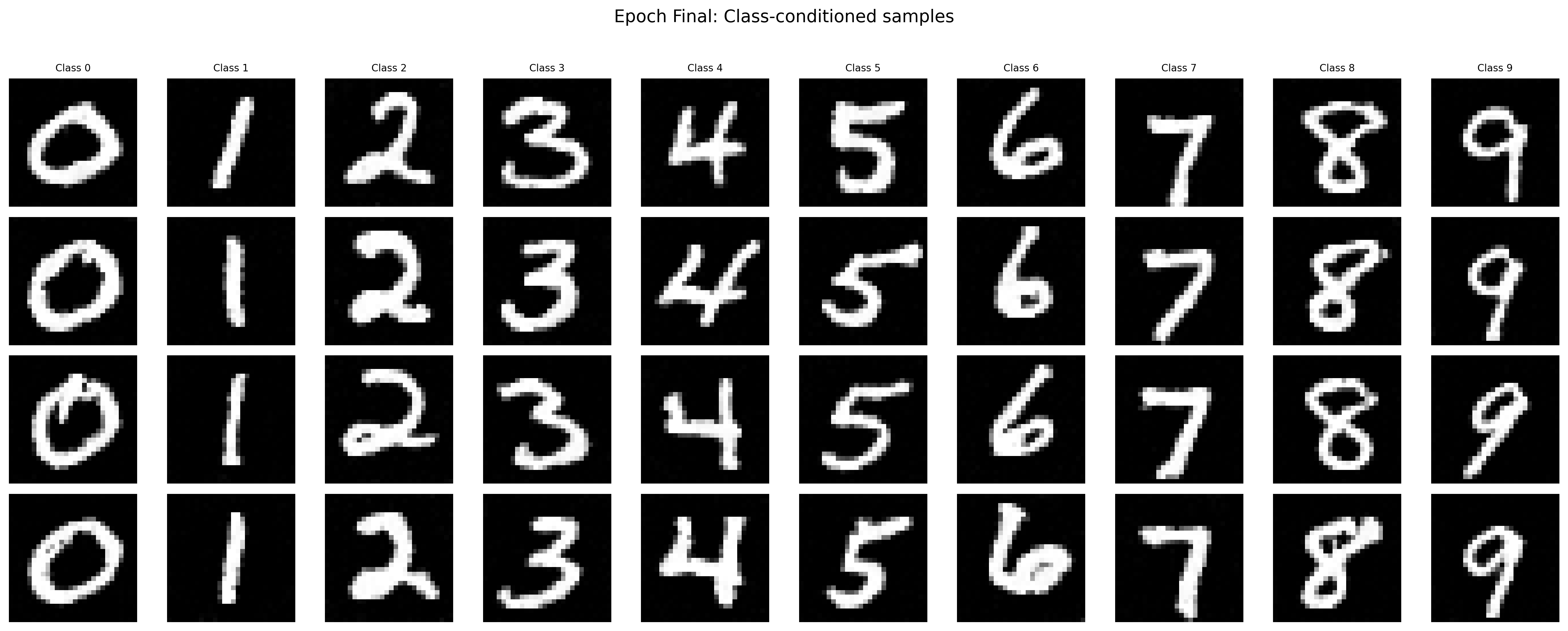 The following images demonstrate the denoising effects from the trained class-conditioned UNet after the first, fifth, and the final epoch. The more the training steps, the better the sampled results.