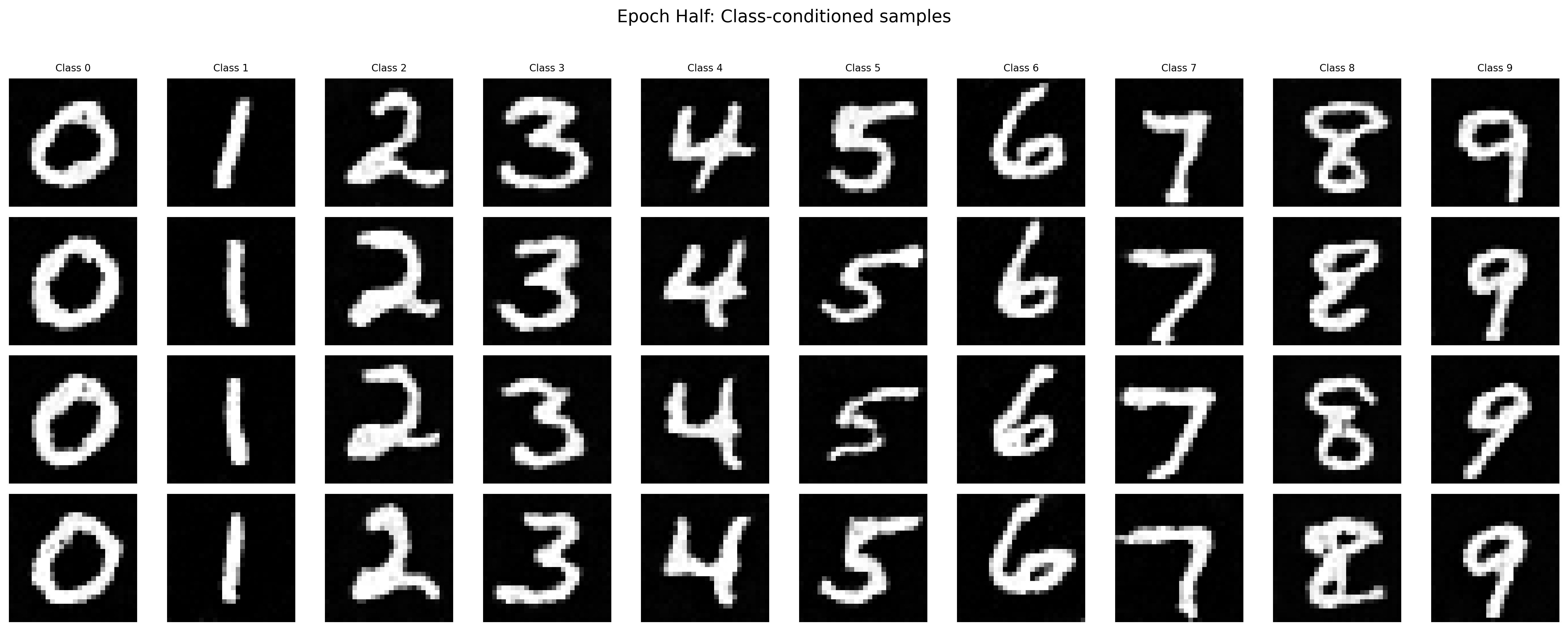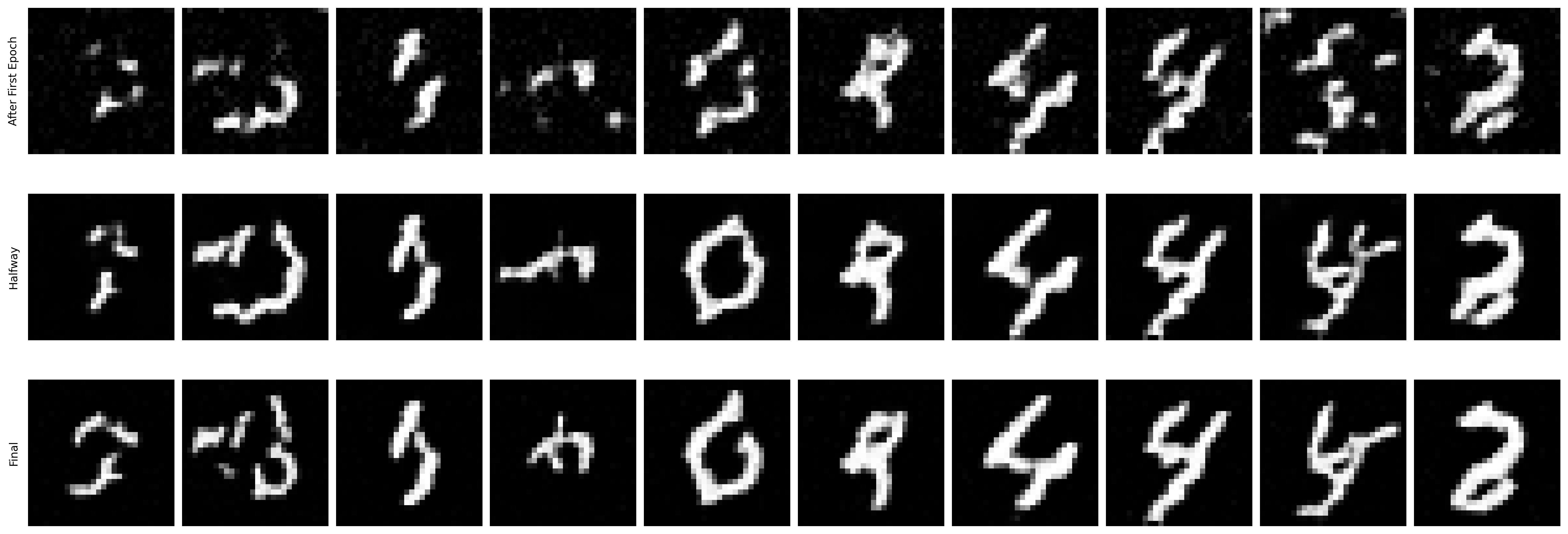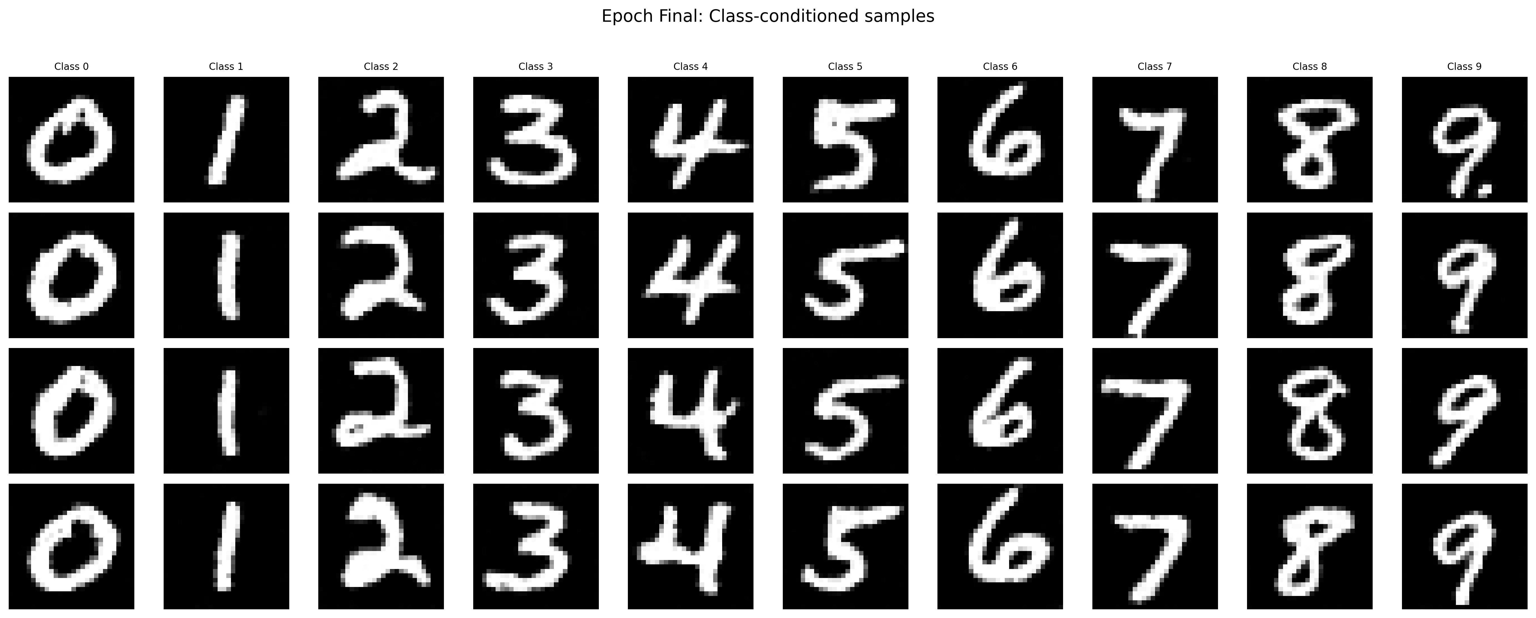 The following images demonstrate the denoising effects from the trained class-conditioned UNet after the first, fifth, and the final epoch. The more the training steps, the better the sampled results.