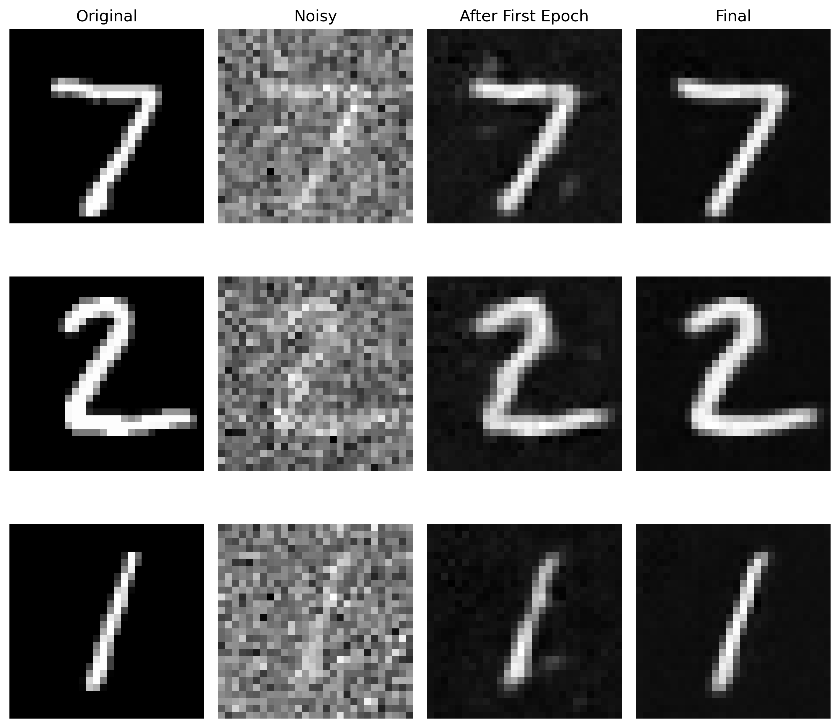 The following images demonstrate the denoising effects from the trained model after the first, fifth, and the final epoch.