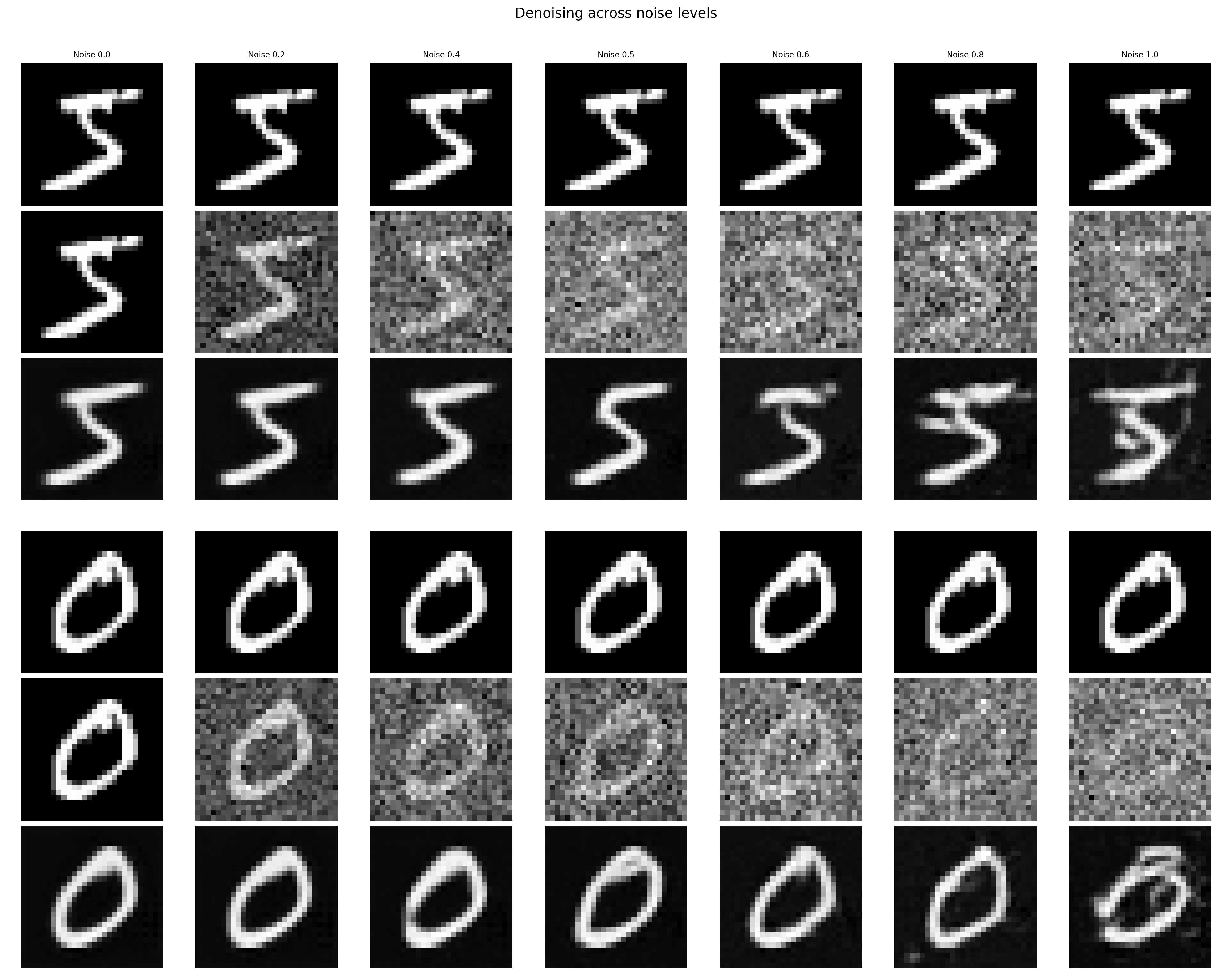 This section tests the trained UNet's performance on out-of-distribution data, ie. images with different noise levels. With a larger noise level, the denoising performance seems to drop, which makes sense since the model is not trained on such levels.