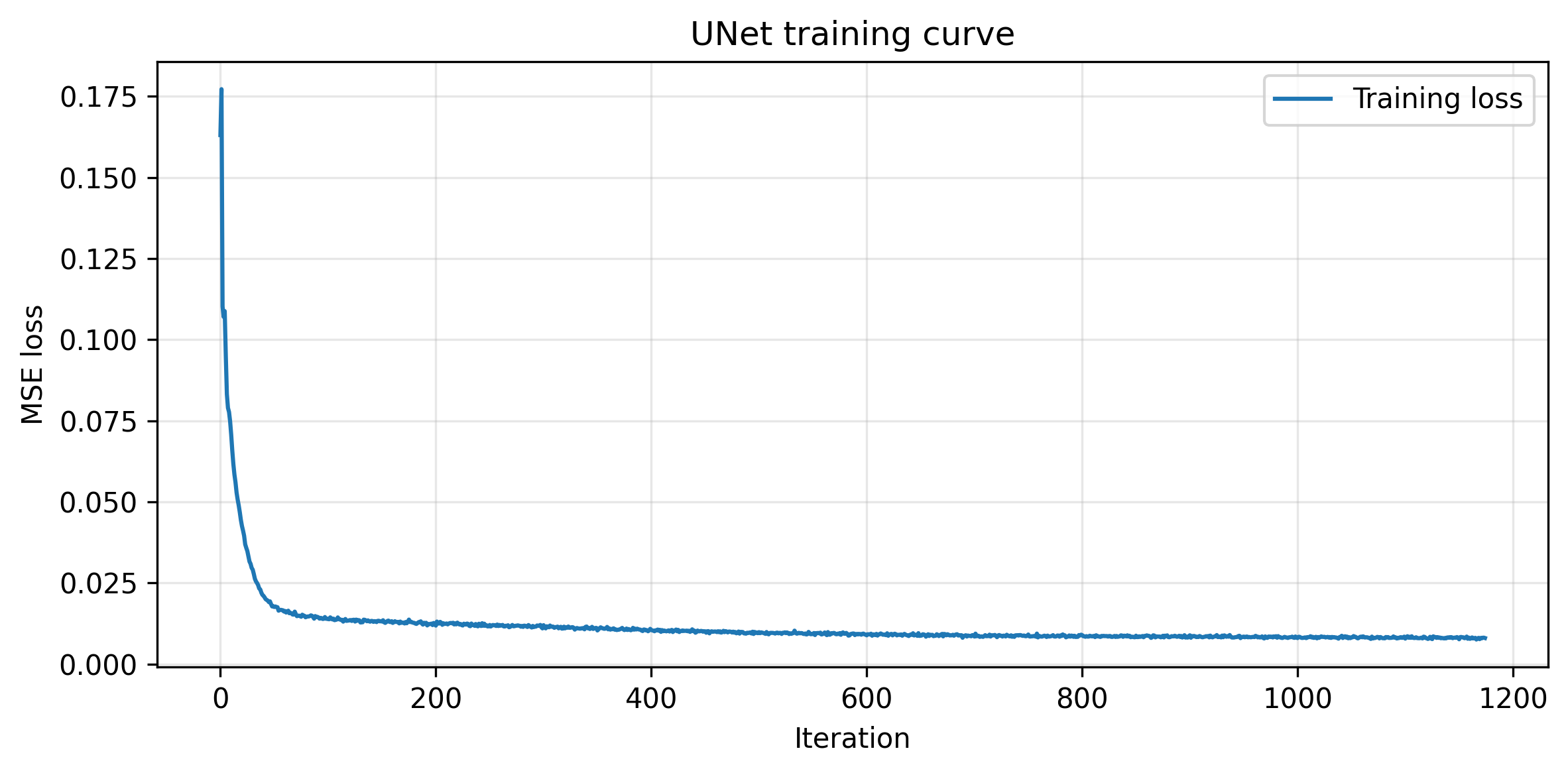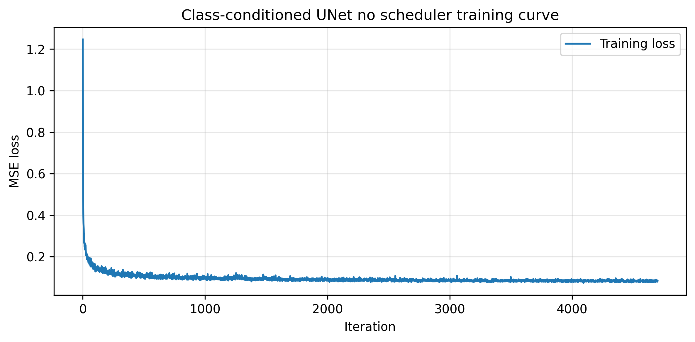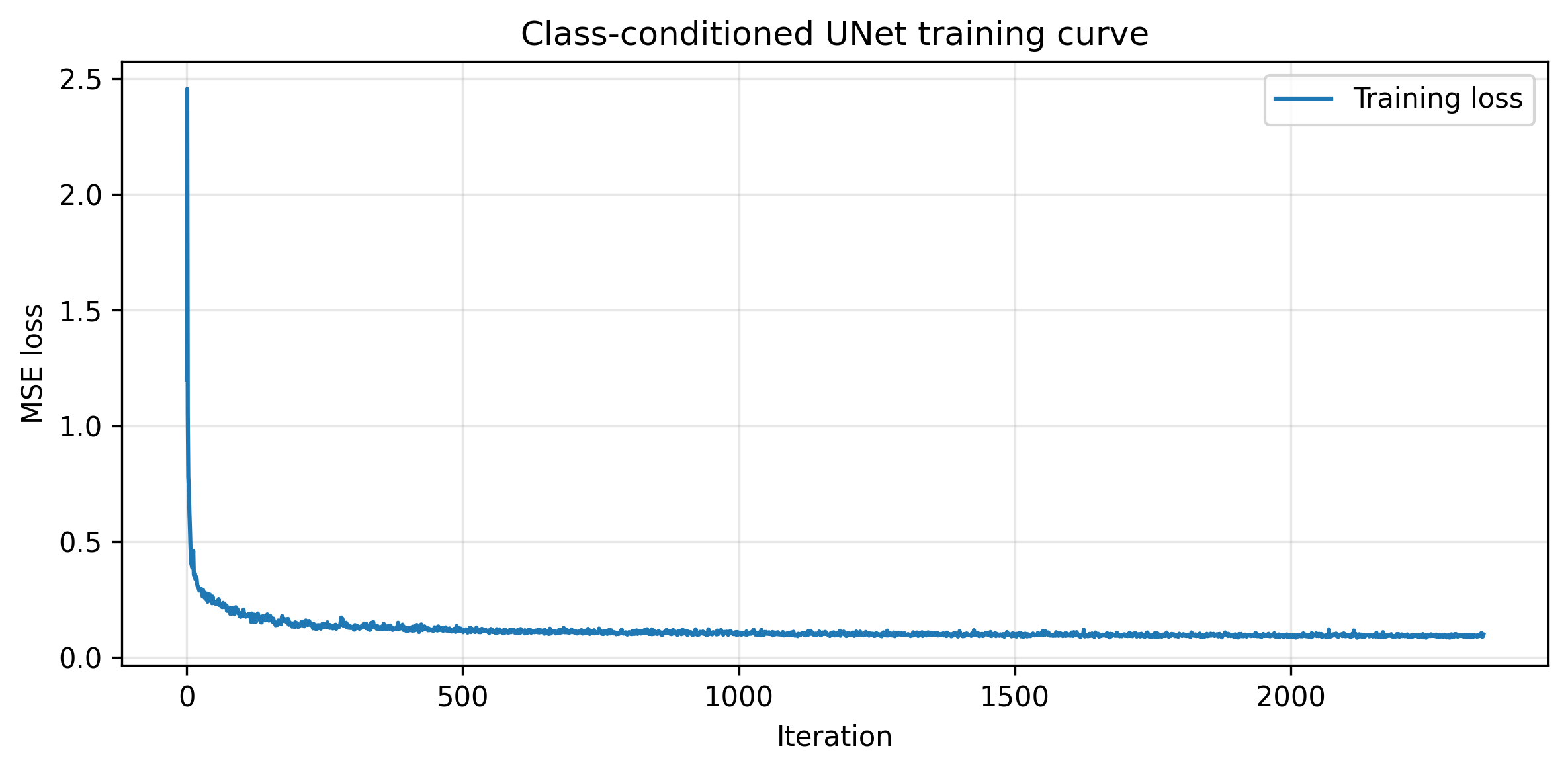 To better generate number images, we can further condition the UNet on the classes. The condition is also added with a fully connected block. Below is the training loss curve of the class-conditioned UNet.