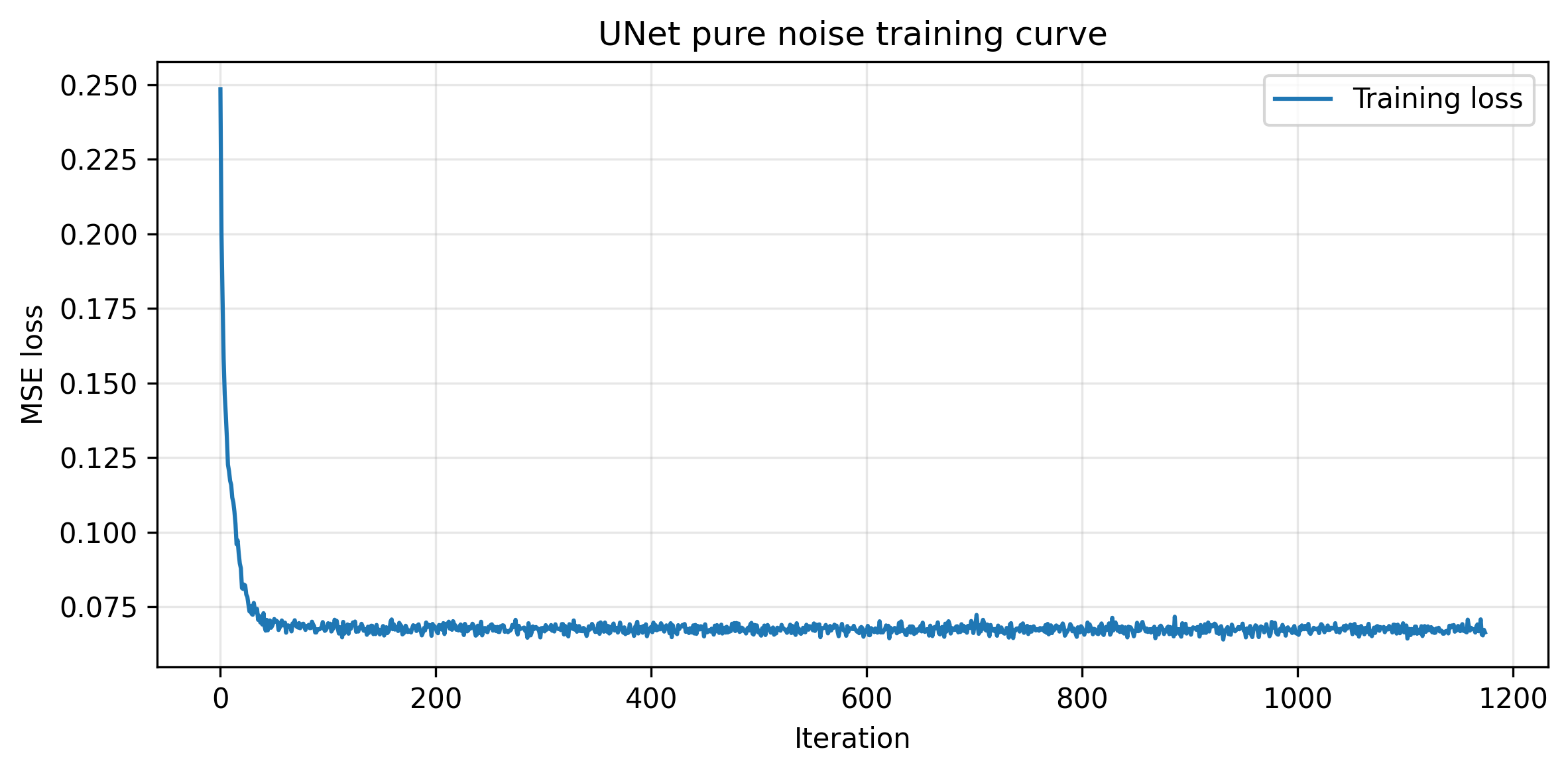 This section trains a UNet to denoise a pure noise. Since the training is not conditioned on the classes, we expect the model to output images that don't look like actual numbers.