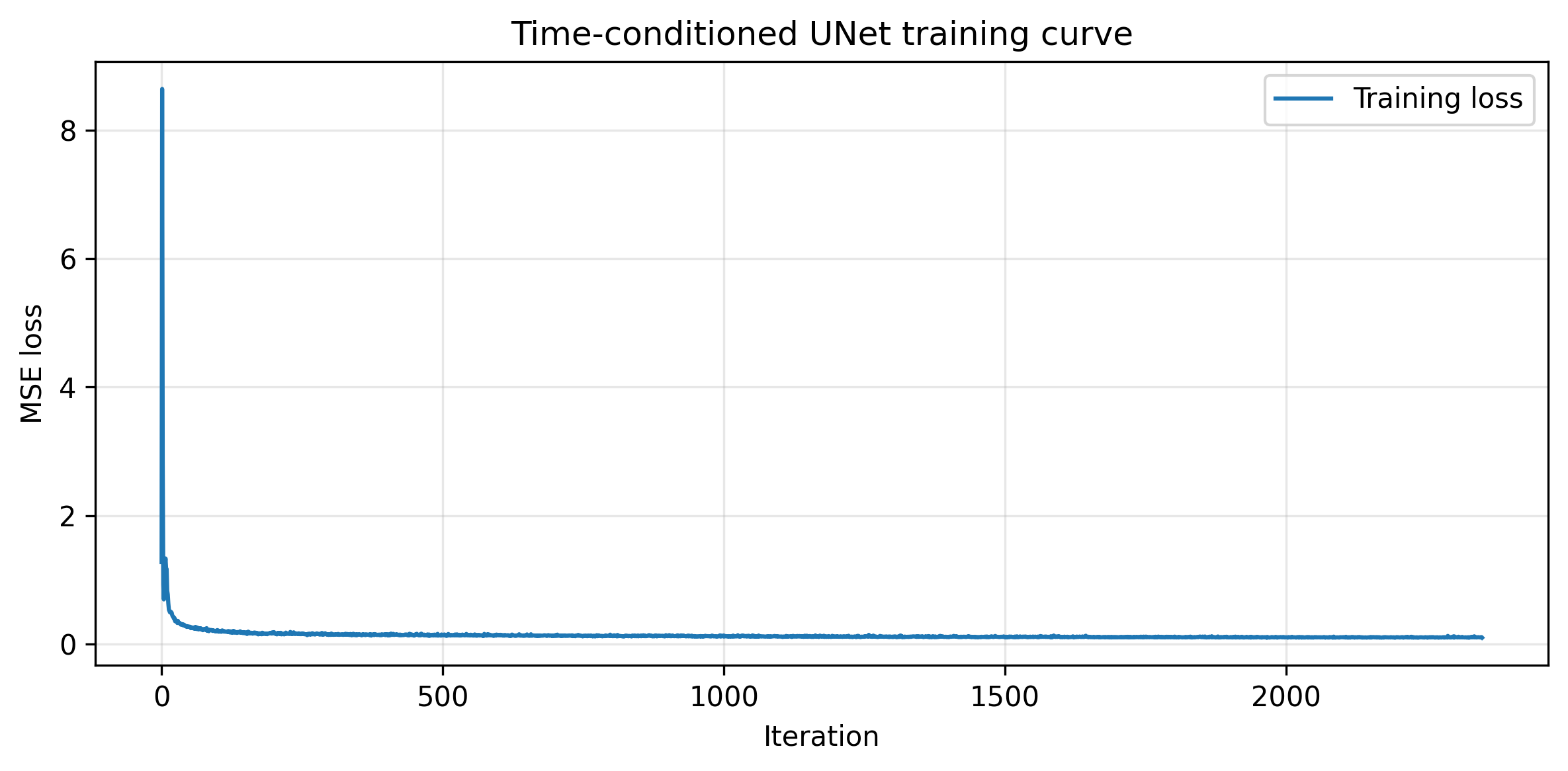We implement the fully connected block and pass the conditioned time variable before the concatenations. This allows the model to learn which time step is this noisy image on. The training loss curve is presented below.